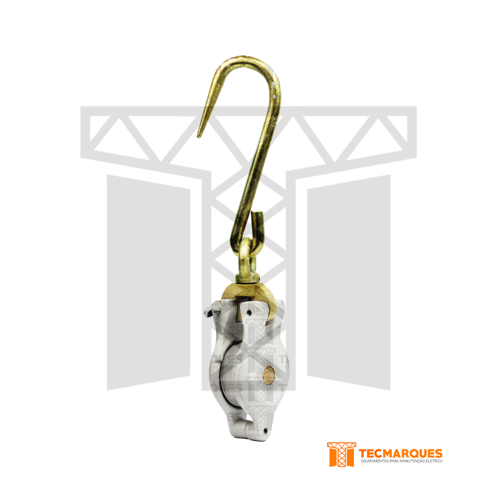 Carretilha para corda TECMARQUES, é feito de liga especial de alumínio com gancho de aço ou aço trefilado. Tem dispositivo para engatar ou desengatar a corda com um diâmetro máximo de 5/8″ levantando materiais rapidamente.